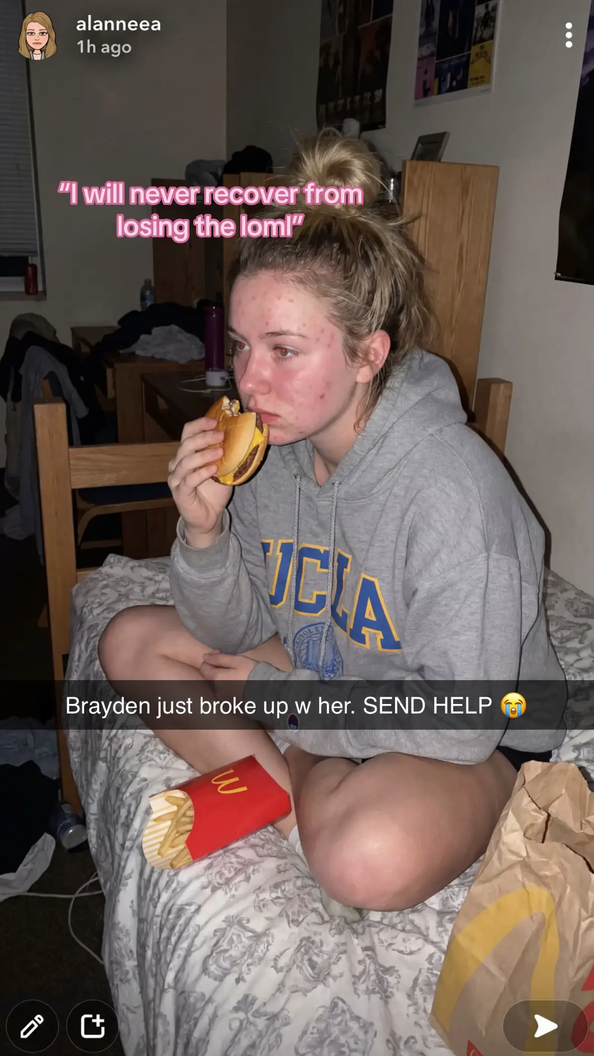 Then I did something important. I opened Snapchat on my phone and added the text "brayden just broke up with her" in that classic Snapchat text bar style.